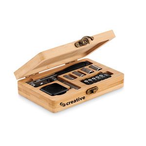 Ensemble d'outils de 13 pièces présenté dans un étui en bambou contenant 6 embouts dans un support avec : 3 embouts (4, 5, 6mm), 2 tailles Philips (PH1, PH2) et 1 adaptateur, 4 douilles (7mm, 8mm, 9mm, 10mm), 1 manche, 1 connecteur et 1 ruban de mesure.