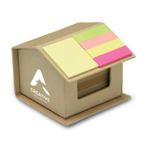 Distributeur de notes en carton recyclé en forme de maison.